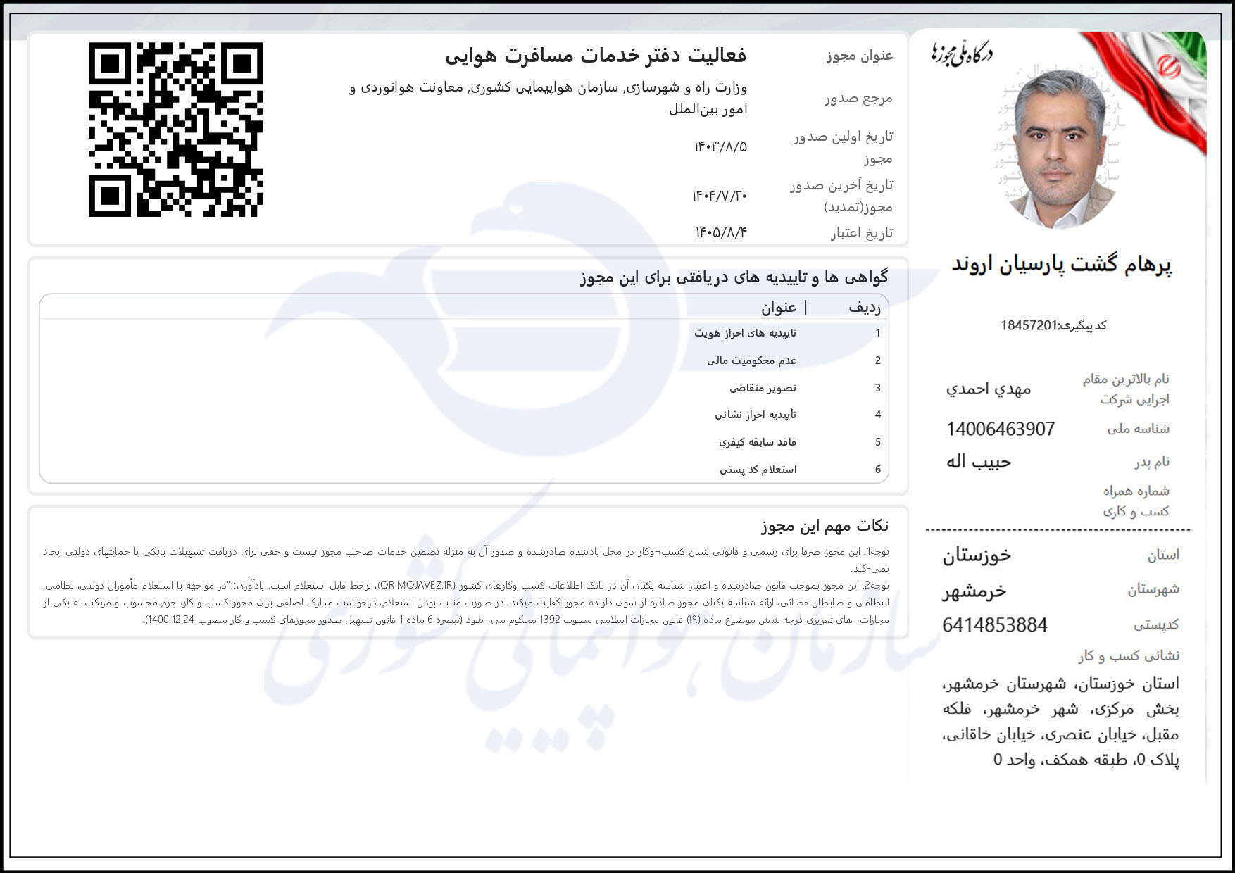 دارنده مجوزهای معتبر قانونی از سازمان هواپیمایی کشوری ، وزرات کار و تعاون اجتماعی و وزارت ( صمت )